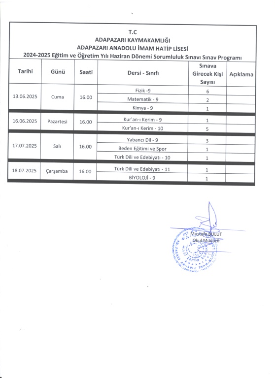 2024-2025 EĞİTİM ÖĞRETİM YILI HAZİRAN DÖNEMİ SORUMLULUK SINAVI TAKVİMİ