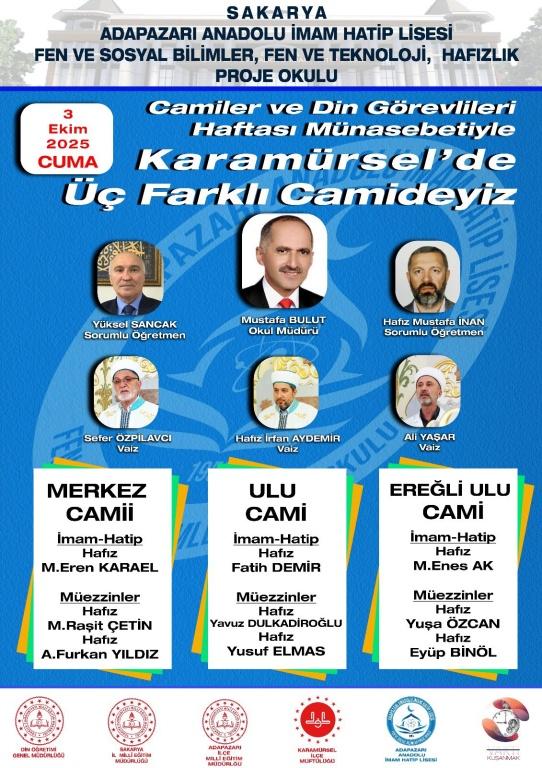 Milli Eğitim Bakanlığı #Türkiyeyüzyılımaarifmodeli projesi, Din Öğretimi Genel Müdürlüğümüzün #vaktikuşanmak projesi, Diyanet İşleri Başkanlığının #minbervemihraptagençlervar projesi kapsamında Camiler ve Din Görevlileri haftası dolayesiyle, Adapazarı Anadolu İmam Hatip Lisesi Fen ve Sosyal Bilimler,Fen ve Teknoloji ,Hafızlık Proje Okulu, Proje İmam Hatip Ortaokulu olarak bu Cuma Karamürsel